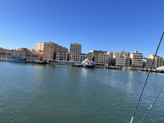 Having announced our arrival to the Harbour staff and them knowing by some magical power that our previous port was in Tunis we were again greeted by Police, Immigration and Coastguards. I filled in various badly photocopied forms and handed over the boat papers (which is the most important document on the boat) and our passports. I am travelling on my Irish passport so that there are no restrictions on my length of stay in Europe but it appears there is some EU treaty that Ireland has not signed up to which the Police explained meant that Jacques and I would be treated differently i.e. he could go ashore immediately and I could not!! In theory I would need a ‘shore pass’ from the office that would open some time tomorrow. As we planned to leave early the next day this was not very helpful! However, the officials, having established we were not smugglers of any sort and that we were leaving first thing and that we were hungry decided to turn a blind eye!!