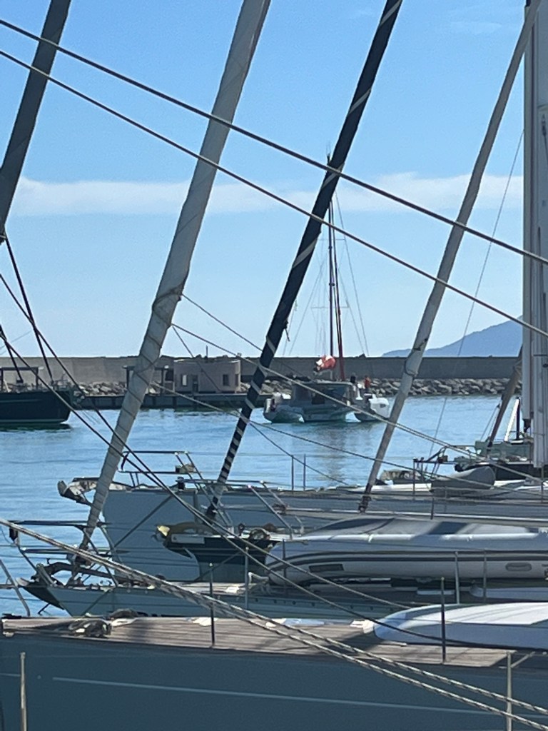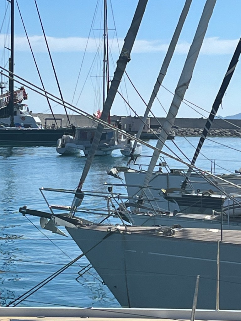 Typically, there having been very little wind whilst at sea, it picked up to gusts of 20 knots as soon as we arrived in the harbour. When we saw a couple of marina guys waving at us from the quay, we dismissed them as surely the space they indicated was not for us as it would be just about big enough: