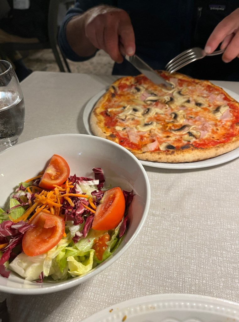 We went to a nice looking but informal restaurant, fairly early with many families and couples eating. We ordered our food and lucky Jacques ended up with double pizza as the waiter delivering 5 pizzas on a tray to our neighbouring table managed to tilt just enough for a ‘Pizza quattro stagioni ‘ to land on his lap!!