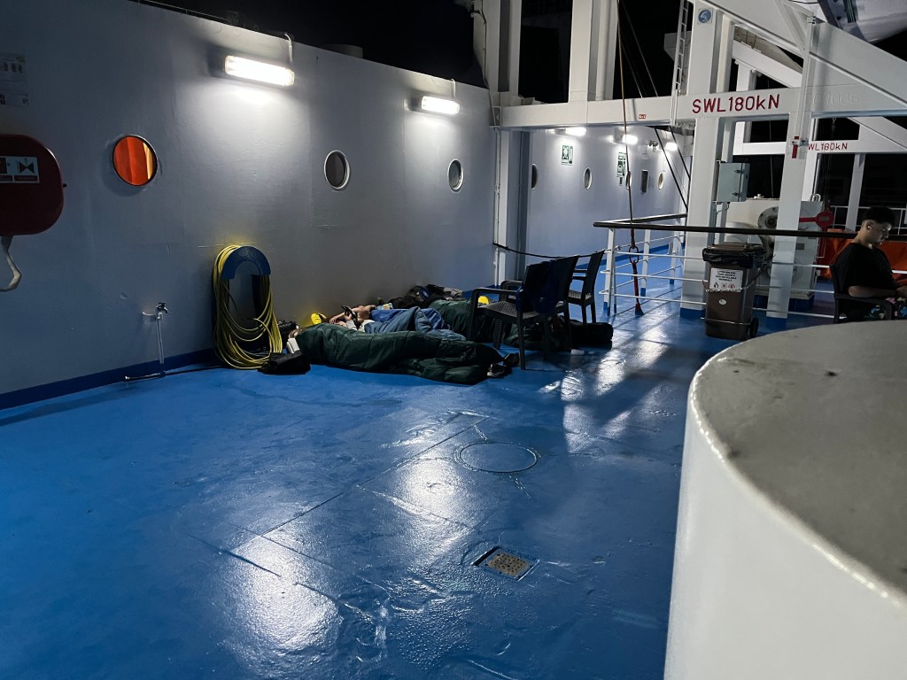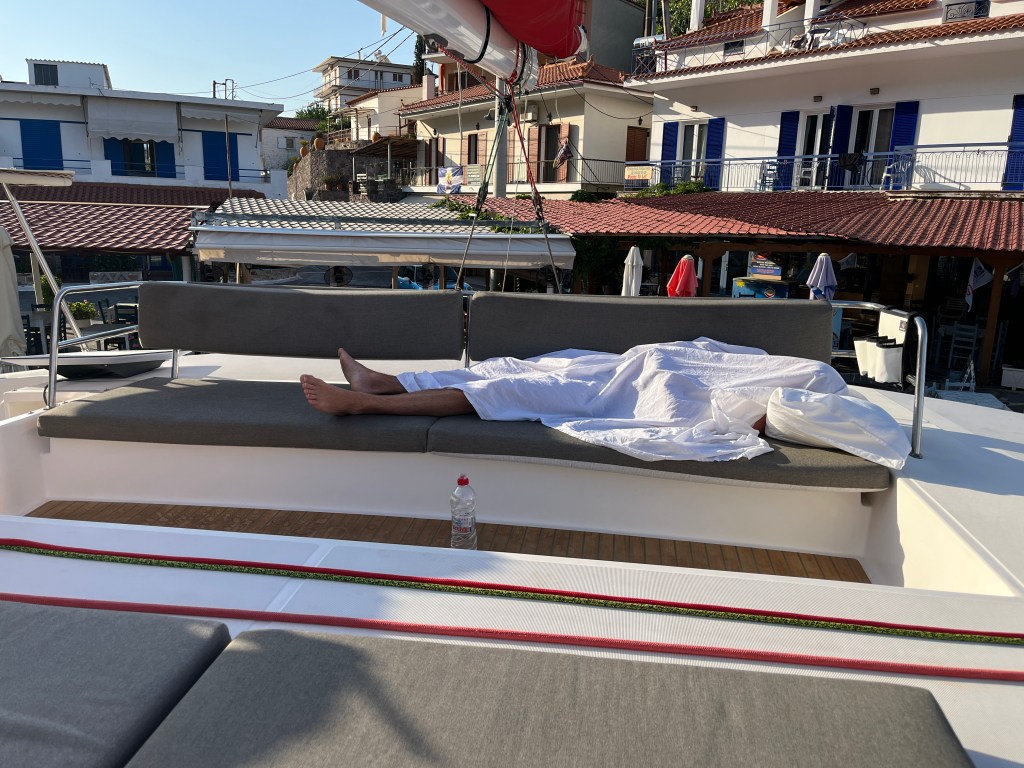 In the last week I have lost count of how many times I have said ‘oh it’s so hot’ and for us this just means getting in to the sea to cool off and at night sleeping on deck. For others this is now life threatening and I’ll come to this later. On a lighter note this is Charlie’s preferred sleep mode and technique for dodging the heat of the rising sun at 7am!