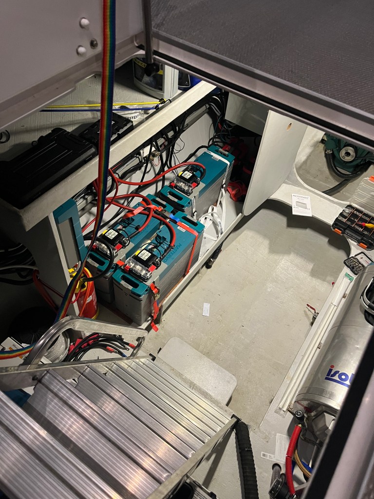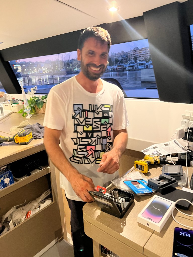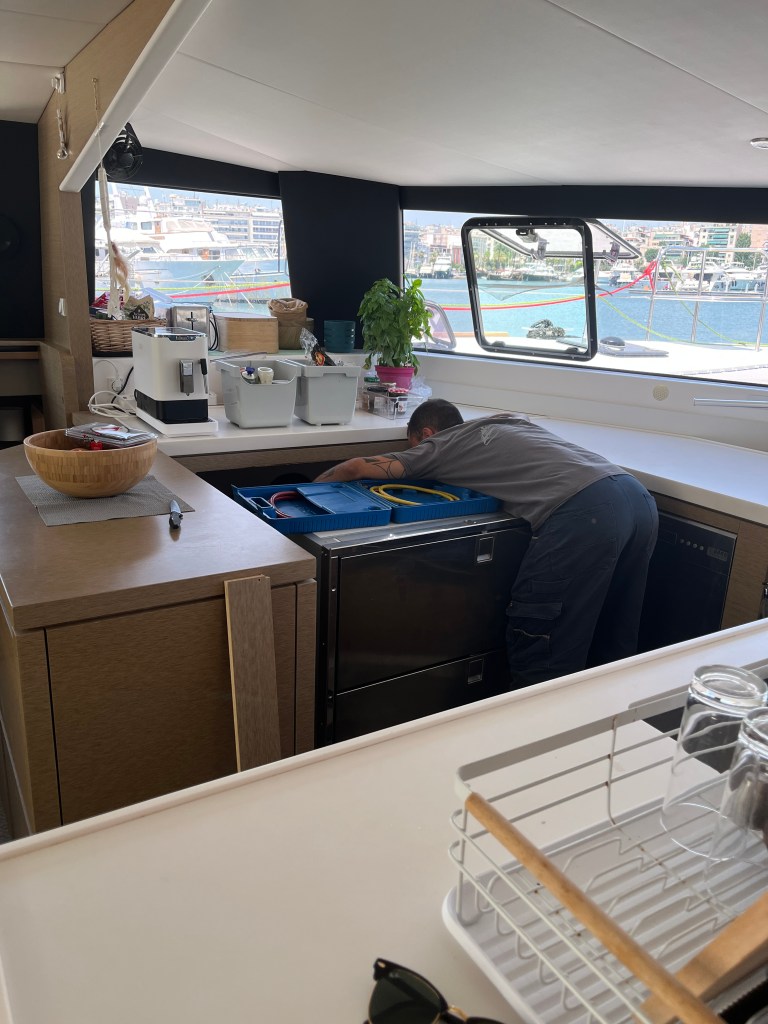 Next on the list were the new batteries and the fixing of the fridge! The plan had always been to eventually replace the boat batteries with Lithium ones which charge up quicker and last longer. The demise of the existing ones whilst Marc & Claudia had the boat made this exercise a more pressing need. The batteries were being supplied and fitted by a specialist company in Athens and the lovely Dimitri worked for 12 hours over the course of 2 afternoons and evenings going up and down from the (incredibly hot) engine room to take out the old batteries (weighing a ton!) and installing the new ones.