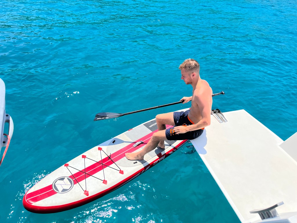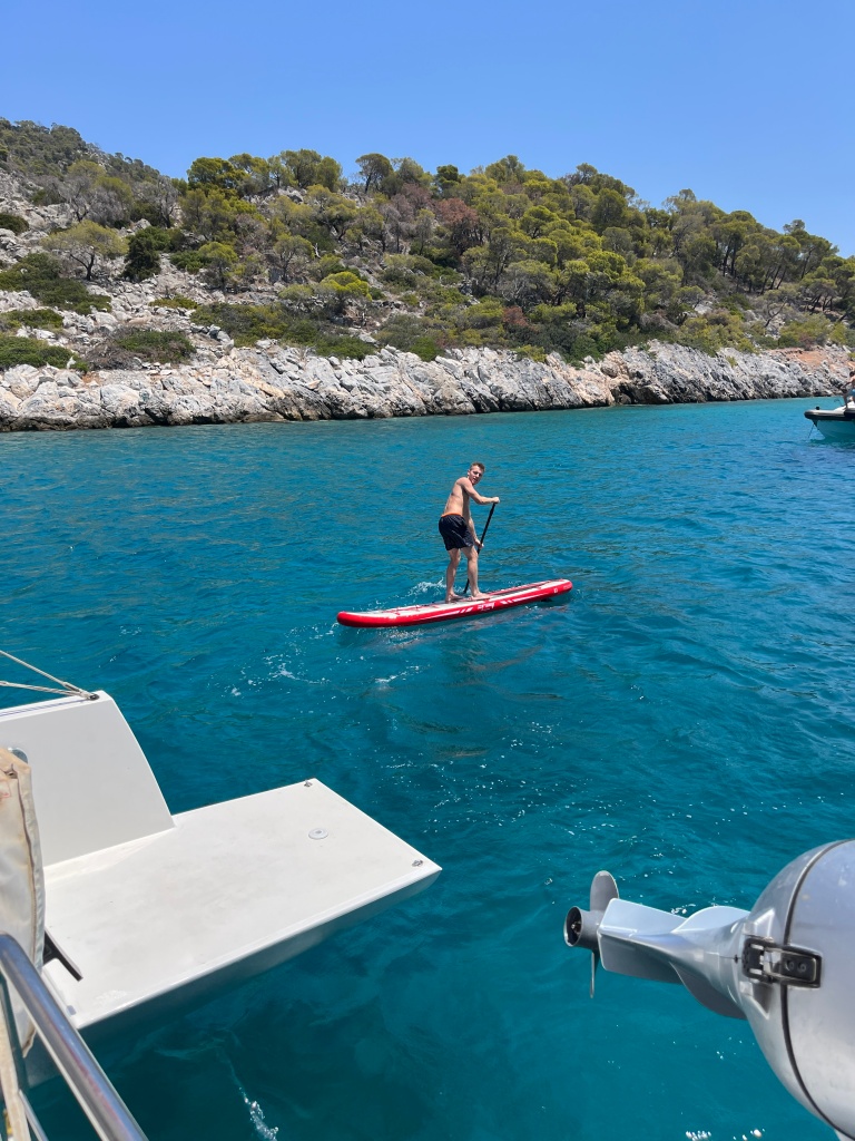 After 2 nights in Vathy we headed back in the direction of Athens and to an enchanting cove where we had the time to inflate and try out the Stand Up Paddle board – Charlie certainly got the paddle part and sometimes the actual stand up as well!!