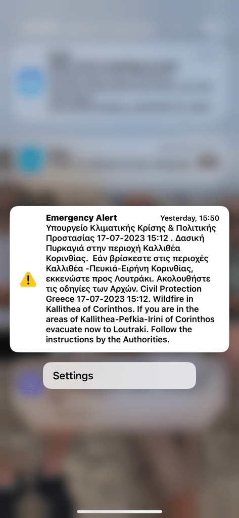 The sky was a huge ash cloud, the smell of acrid burning was heavy in the air and the boat was covered in a layer of ash. I was also included on the Greek text alert for emergency situations.