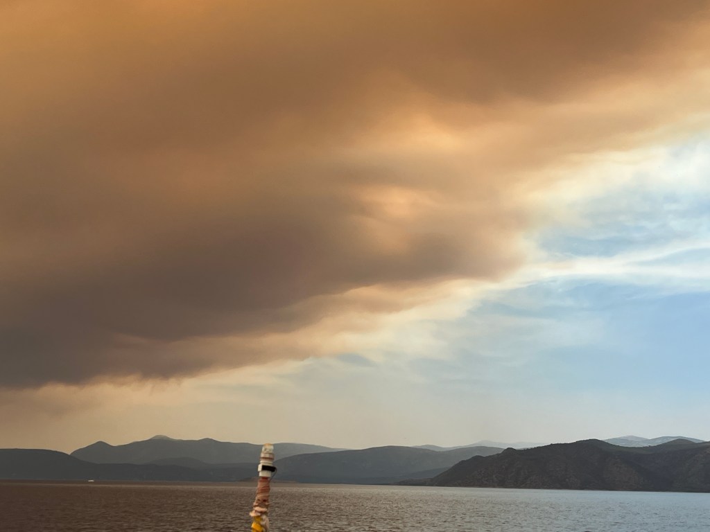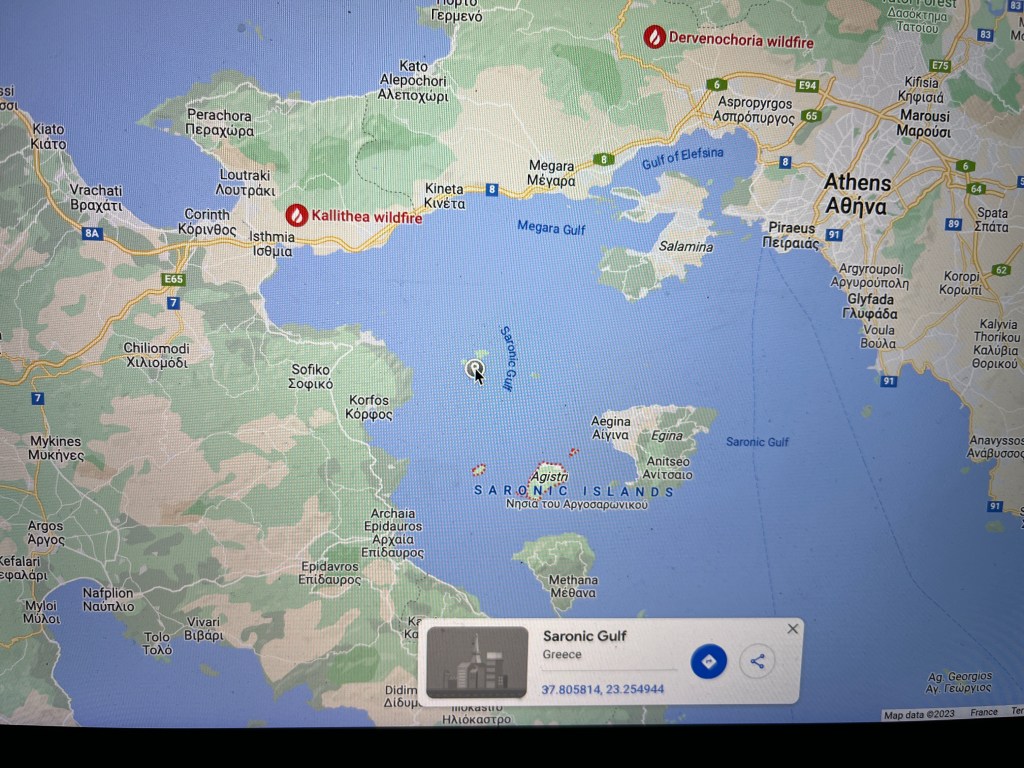 Our last night at sea before heading back to Athens was spent in another small cove off the island of Agios Thomas – this is a map that shows the area we covered – the pin is Agios Thomas and you will also see marked the two huge wildfires that started on that day.