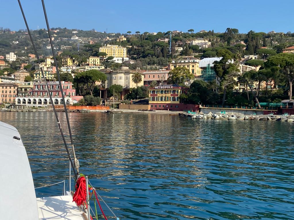 When we left Genoa, still at the time with the previous owners Marc and Claudia, we took 3 hours to sail to the bay of Santa Margherita in Portofino. The sea was slightly choppy and although we had blue skies the wind was cold as we sat up on deck. I decided to go get some more layers of clothing and that meant going down into the boat and that’s when I started to feel not just cold but sick! My usual golden rule of ‘no matter how fab the weather, if the sail is over 2 hours take a sea sick tablet’ had been forgotten in all the excitement of heading out for the first time on our own boat!